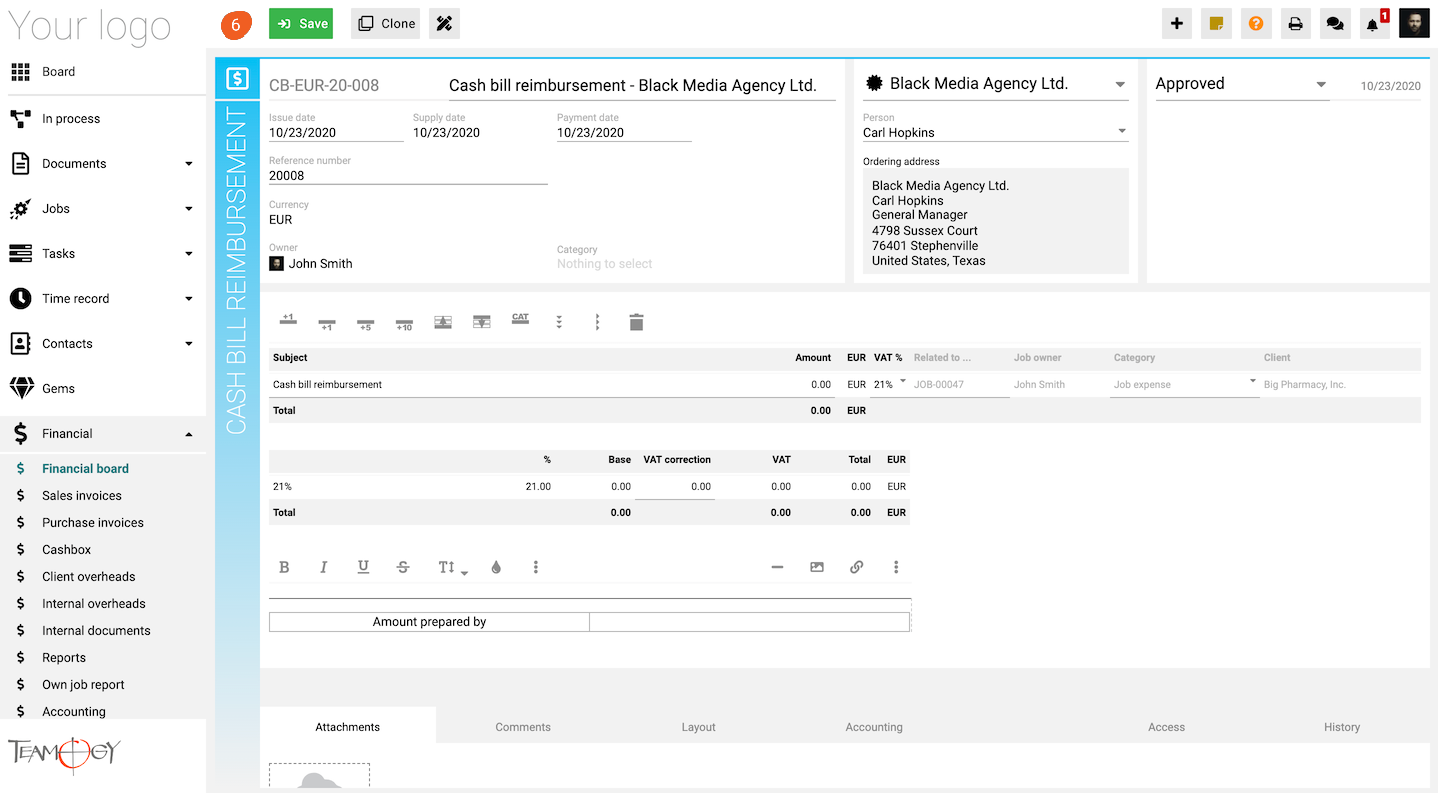 Niektóre dokumenty w systemie Teamogy (Kosztorys, zamówienie, faktura kosztowa, faktura sprzedaży, Timesheet, Zwrot kosztów) są bezpośrednio powiązane z Jobem, więc bezpośrednio w Jobie możesz porównać kosztorys, koszty, pracę i marżę oraz zysk do rzeczywistych wartości.