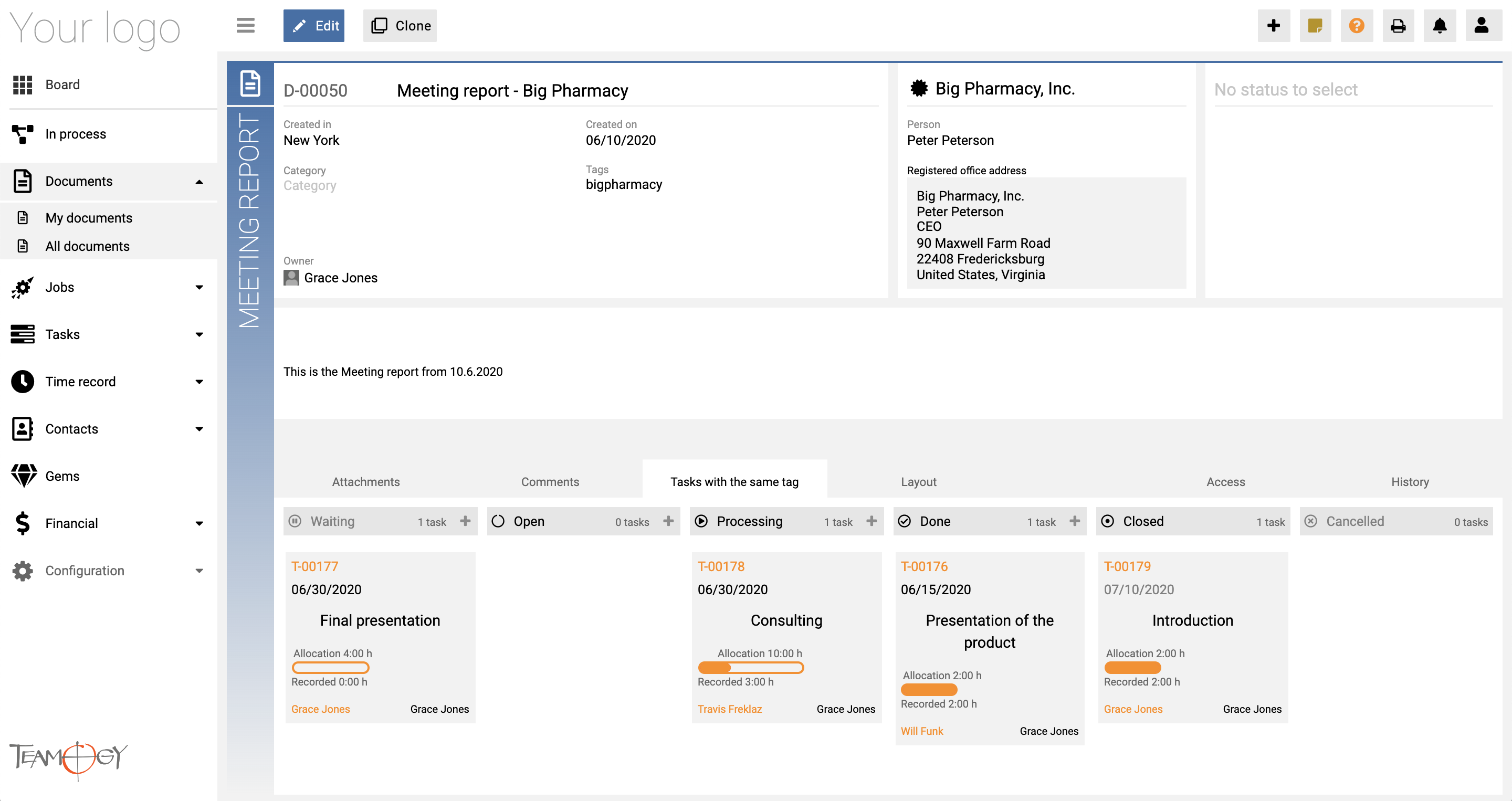 Raport ze spotkania dobrze współdziała z tagami.. Jeśli oznaczyłeś Raport ze spotkania tym samym tagiem co zadania, system automatycznie zaoferuje zakładkę w Raporcie ze spotkania z zadaniami, które mają ten sam znacznik. Jest to bardzo przydatne narzędzie, które uczyni twoją pracę prostszą i bardziej efektywną.